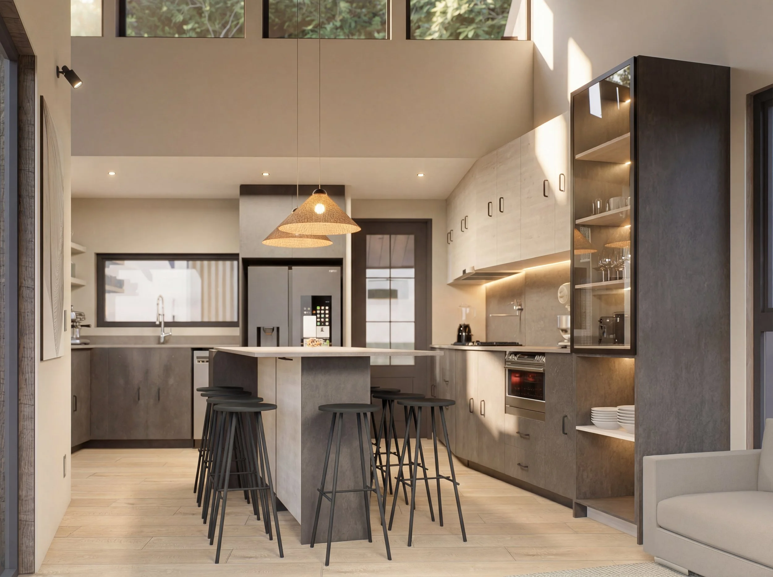 La Casa Alerce es una vivienda de 135 m² pensada para la vida de playa, con una organización lineal que separa con claridad el área privada (3 dormitorios y 3 baños) del área social, abriéndose hacia el paisaje. Su volumen principal se orienta a capturar la vista al mar mediante grandes paños vidriados y una terraza continua, mientras una ducha exterior resuelve el retorno desde la playa de forma práctica y limpia.