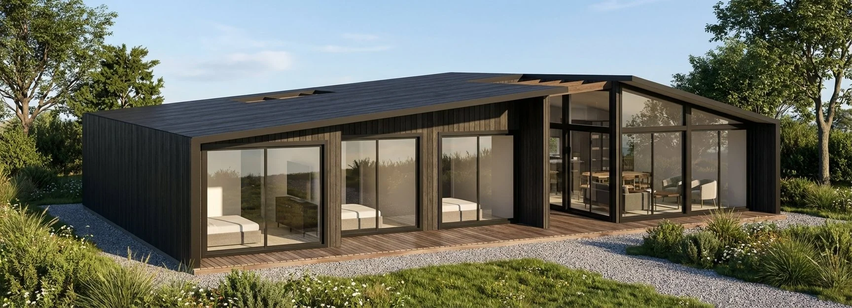Su arquitectura contemporánea destaca por los ventanales de piso a cielo y el volumen central en doble altura que integra el living, comedor y cocina, generando amplitud y luminosidad. Cada espacio está diseñado para invitar a contemplar el entorno, ya sea en medio del bosque, a orillas de un lago o en un terreno de campo.